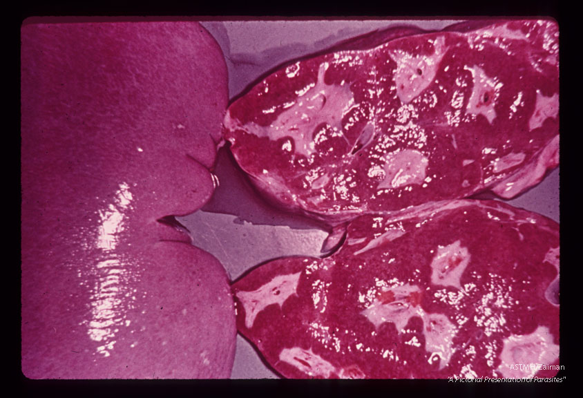 Description: Same patient. Cut surface of liver showed marked periportal fibrosis. the intervening parenchyma being fairly normal. Many cases with severe disease show less portal fibrosis. The enlarged spleen weighed 700 grams.