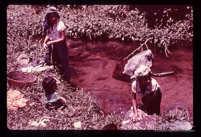 Women washing clothes, in stream which produces biting flies,in endemic region.