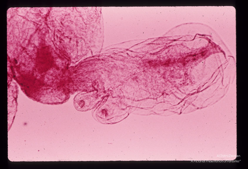 Description: A 32 month old white male in South Dakota suffered progressive lassitude, anorexia, irritability, incoordination and infrequent vomiting. A suboccipital craniotomy was performed during which a grape-like mass of translucent thin wall cysts was discovered and partially evacuated with difficulty. Subsequently patient developed flexion rigidity of the extremities, non-reactive pupils and decreased consciousness. A sinus tract at the operative site con­tained more cysts. The patient died three months after the onset of symptoms. Cyst wall with two scolices in field.