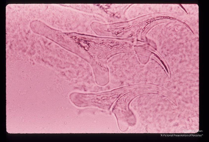 Description: A 32 month old white male in South Dakota suffered progressive lassitude, anorexia, irritability, incoordination and infrequent vomiting. A suboccipital craniotomy was performed during which a grape-like mass of translucent thin wall cysts was discovered and partially evacuated with difficulty. Subsequently patient developed flexion rigidity of the extremities, non-reactive pupils and decreased consciousness. A sinus tract at the operative site con­tained more cysts. The patient died three months after the onset of symptoms. High power view of hooks.
