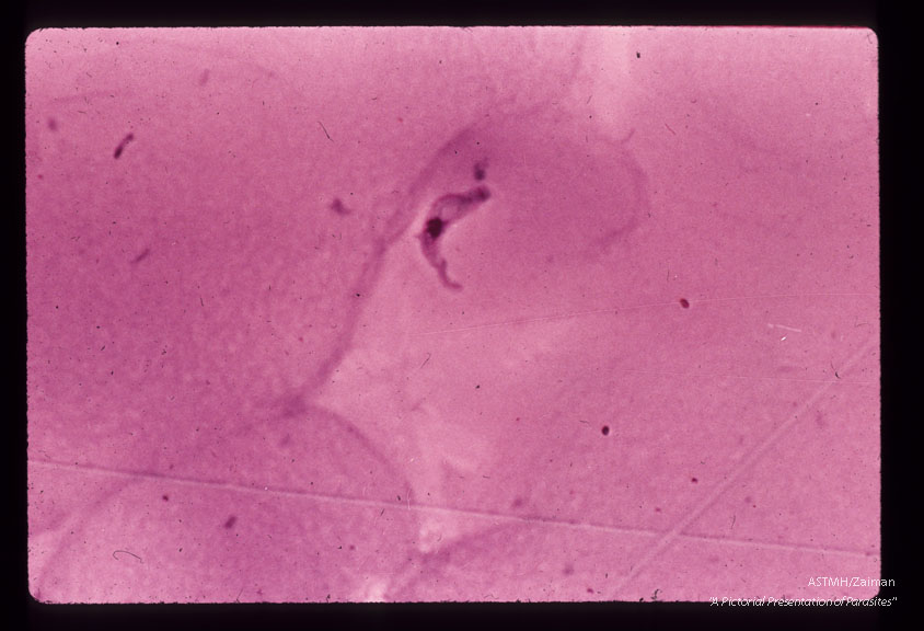 Description: A seventy-one year old white male, with a history of malaria 40 years earlier, complained of weakness of three weeks duration following a vacation trip through Botswana, South Africa in July and August of 1971. During that trip he suffered many insect bites. In September because of malaise, chills and fever, he started taking quinine. A local physician subsequently prescribed quinine and Daraprim. The chills and fever abated but weakness persisted. He became anorectic and lost weight. Physical examination in New York (Dr. Hoskins) was remarkable for lethargy, mild cnoephalopathy on HIP testing but no localizing signs, bilateral, cervical, axilary and inguinal lymphadenopathy. Laboratory examination revealed slight anemia, and motile trypanosomes in the; peripheral blood The spinal fluid was clear, opening pressure 130mm. H2O, 4RBC, 33WBC, 84% mono, 16% sugar, 58% protein. Twenty eight motile trypanosomes / mm3 were seen in the counting chamber. The patient was treated with Suramin and Mel B (Arsobal) . The parasitemia disappeared, the CSF cleared. The patient probably suffered a transient reaction to Mel B (AS1) with muscle weakness, proximal more than distal with decreasing vibratory sense and fine tremor. In spinal fluid of same patient.