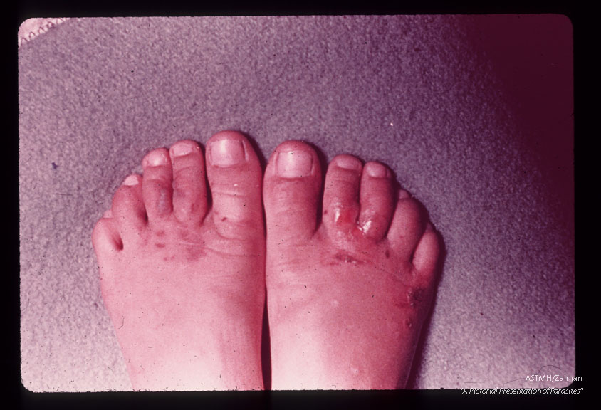 Feet and buttocks involved. White material probably an ointment.