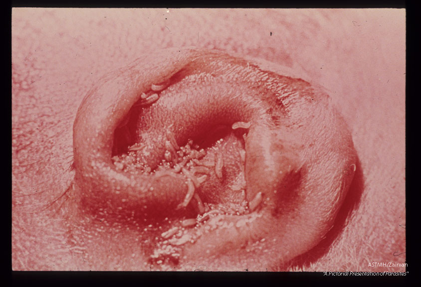 Description: Myiasis. Premature infant died shortly after birth. Numerous first stage larvae were present in the ear. Similar larvae were recovered from the mothers vulva. Efforts to rear maggots were unsuccessful.