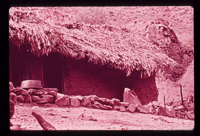 Description: Epidemiology. Typical adobe house with thatched roof within which are found people, chickens, guinea pigs, and infected triatomines. The most important vector here was Rhodnius ecuadoriensis.
