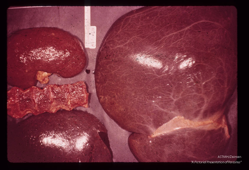 Description: A 69 year old white male received 10 pints of blood shortly before, during and after gastrectomy for a benign gastric ulcer. One of the donors, a previously infected veteran of the Viet Nam war, registered at the blood bank under a false name and addrer Approximately four weeks after the surgery the patient developed a fatal case of falciparum malaria. Deeply pigmented enlarged liver, kidney and sectioned vertebral bodies.