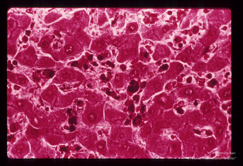 Description: A 69 year old white male received 10 pints of blood shortly before, during and after gastrectomy for a benign gastric ulcer. One of the donors, a previously infected veteran of the Viet Nam war, registered at the blood bank under a false name and addrer Approximately four weeks after the surgery the patient developed a fatal case of falciparum malaria. Demonstration of malarial pigment in the liver at the microscopic level.