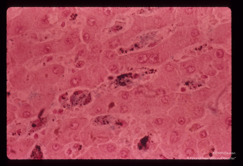 A 69 year old white male received 10 pints of blood shortly before,  during and after gastrectomy for a   benign gastric ulcer.    One of the donors,  a previously infected veteran of the Viet Nam war, registered at the blood bank under a false name and addrer Approximately four weeks after the surgery the patient developed a fatal case of falciparum malaria.  Bile, iron and malarial pigment are demonstrated in this slide.
