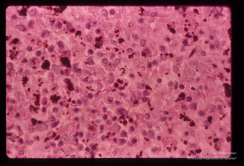 Description: A 69 year old white male received 10 pints of blood shortly before, during and after gastrectomy for a benign gastric ulcer. One of the donors, a previously infected veteran of the Viet Nam war, registered at the blood bank under a false name and addrer Approximately four weeks after the surgery the patient developed a fatal case of falciparum malaria. Demonstration of pigment in spleen of same patient at the microscopic level.