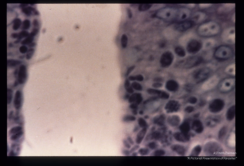 Description: Schizonts in ileum of kitten. Giemsa