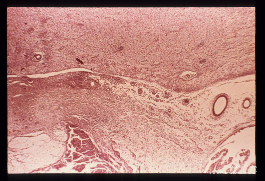 Description: Toxoplasmic encephalitis showing transition of ependymal ulceration to full-blown periventricular necrosis.
