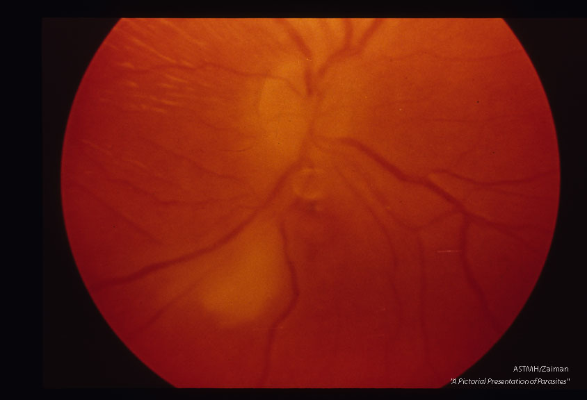 Toxoplasmic retinochoroiditis, left eye, approximately 10 days duration.