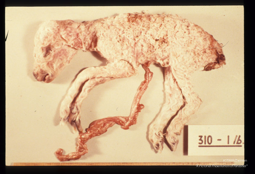 Description: An experimentally infected ewe aborted this dead stunted lamb 148 days after intravenous injection with Toxoplasma gondii.