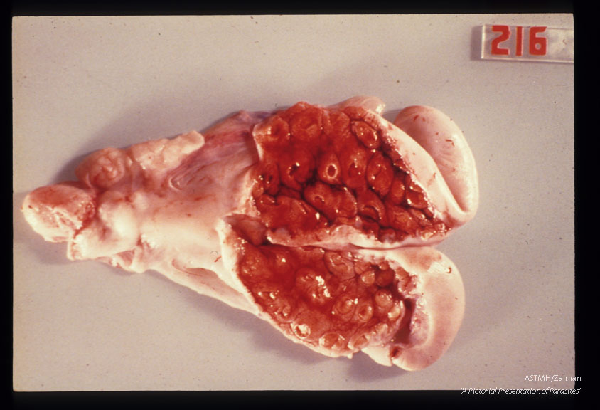 Description: Involuting uterus from recent abortion. Ewe was fed cysts of Toxpplasma gondii on day 23 of pregnancy and sacrificed on day 87.