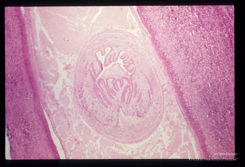 Description: Cysticercus compressed by forehead tissues.