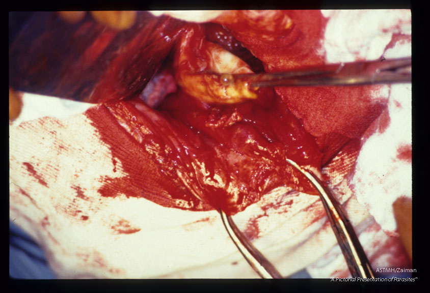 Description: A 26 year old Italian male presented with jaundice due to biliary tree obstructions by daughter cysts of Echinoccocus granulosus. Picture sequence of operative dissection. Removal of cysts, placement of multiple drains and creation of several anastomoses were required to ensure proper biliary drainage and to prevent bile peritonitis.