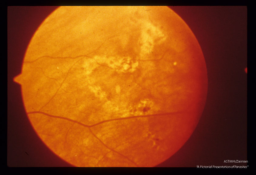 Description: In human eye. Part of pigmented track resulting from migration of trematode.