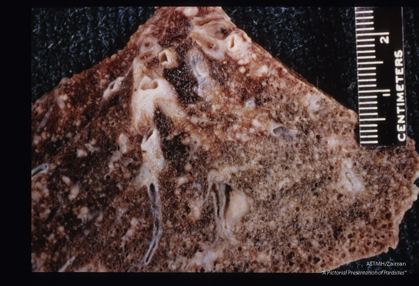 Gross pathology. Lung slices showing pseudotubercles in fatal pulmonary schistosomiasis.