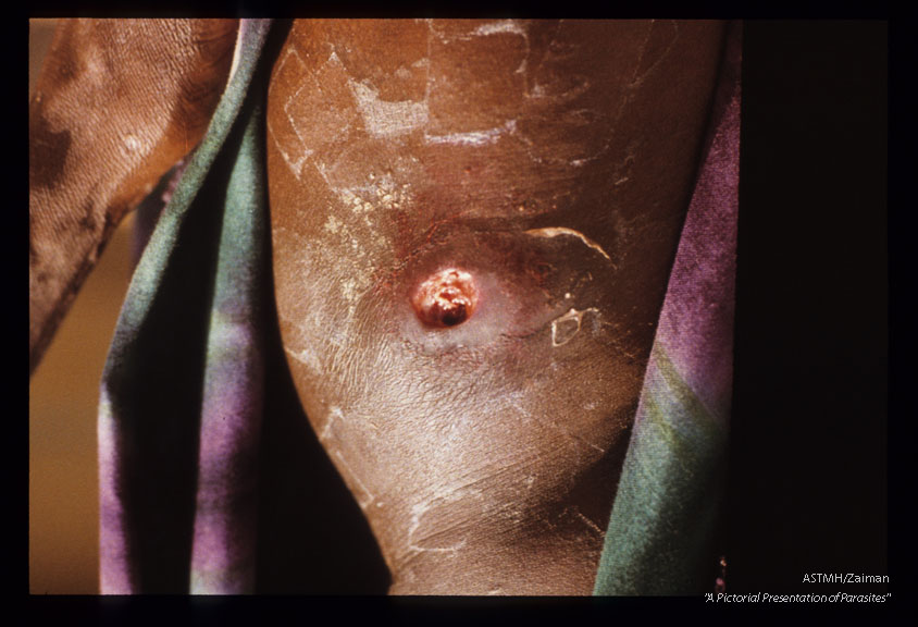 Description: Rare case of a perforating nodule at the iliac crest of an adult man. Female Onchocerca volvulus are in the wound. From St. Paul River in Liberia.