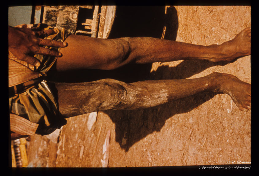 Description: Adult man with typical sowda of the right leg with many lesions from scratching in response to severe itching. Wadi Al Barh, Yemen Arab Republic.