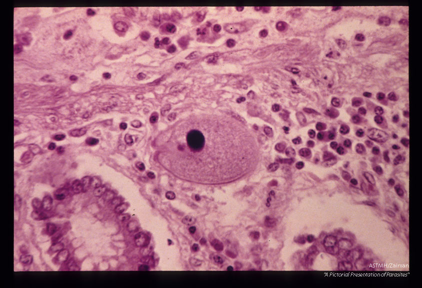 Description: Single trophozoite is present in the bowel wall. Note the cytostome.