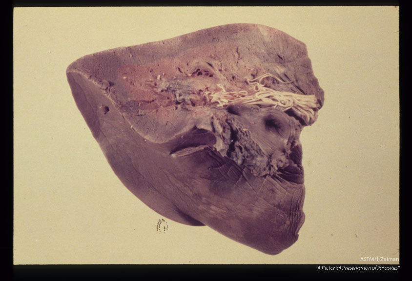 Description: Multiple adult worms are present in the veins of a dog liver.