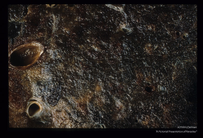 Autopsied human lung showing hemorrhagic pneumonia and the etiologic agent, a mesocercaria in the patient's lung.