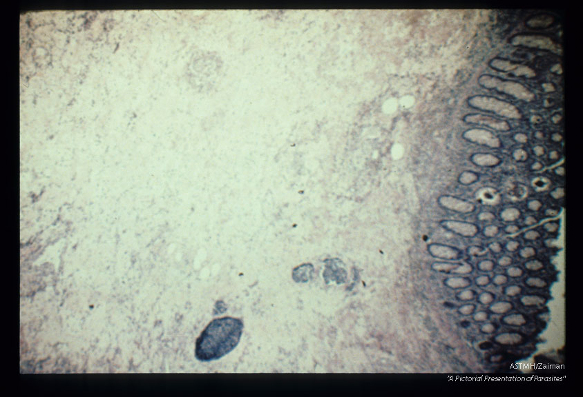 Description: Multiple sections through anisakid nematodes and inflammatory infiltrate they induced in a human cecum.
