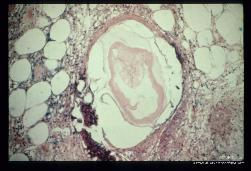 Description: Multiple sections through anisakid nematodes and inflammatory infiltrate they induced in a human cecum.
