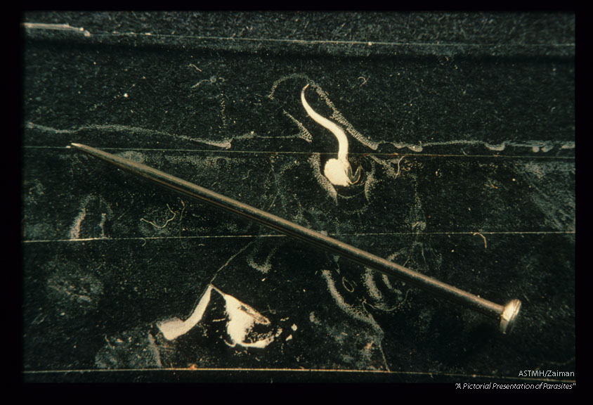 Description: Disrupted adults trapped by scotch tape. A pin is superimposed to indicate worm size.