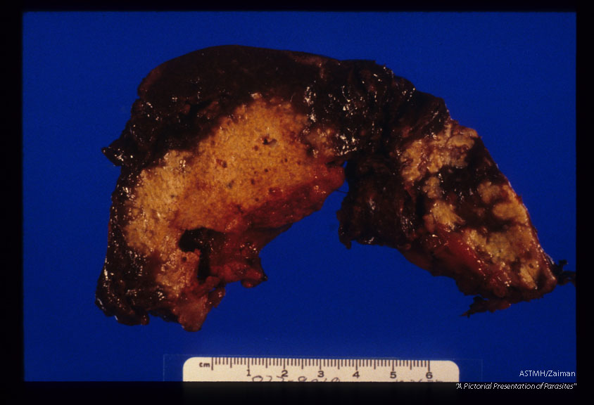 Description: Gross and microscopic photos of human liver from Minnesota where about one half of the red foxes are infected.