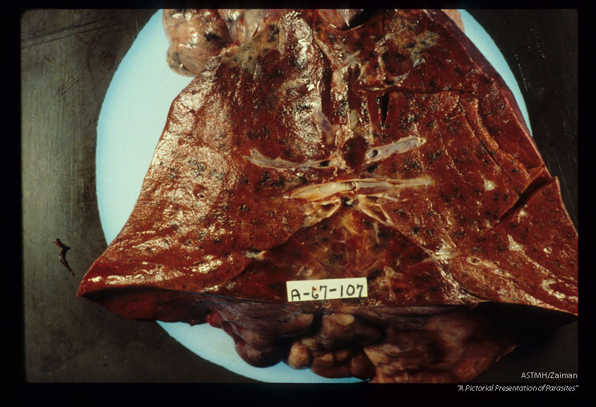 Description: Gross lung specimen showing brick red colored pneumonia.