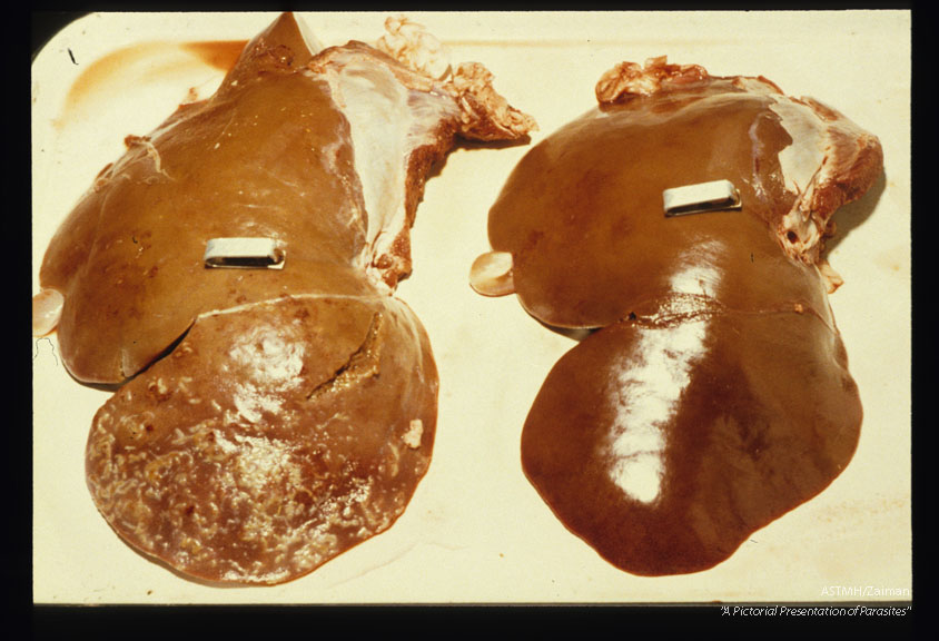 Description: Normal sheep liver and one damaged by migrating larvae.