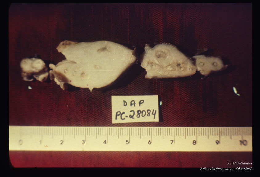 Abdominal mass which contained adult Ascaris (1407, 1408) and eggs (1409) was surgically removed from a patient. There was direct communication with the large bowel. Note cell division in the egg (1409).
