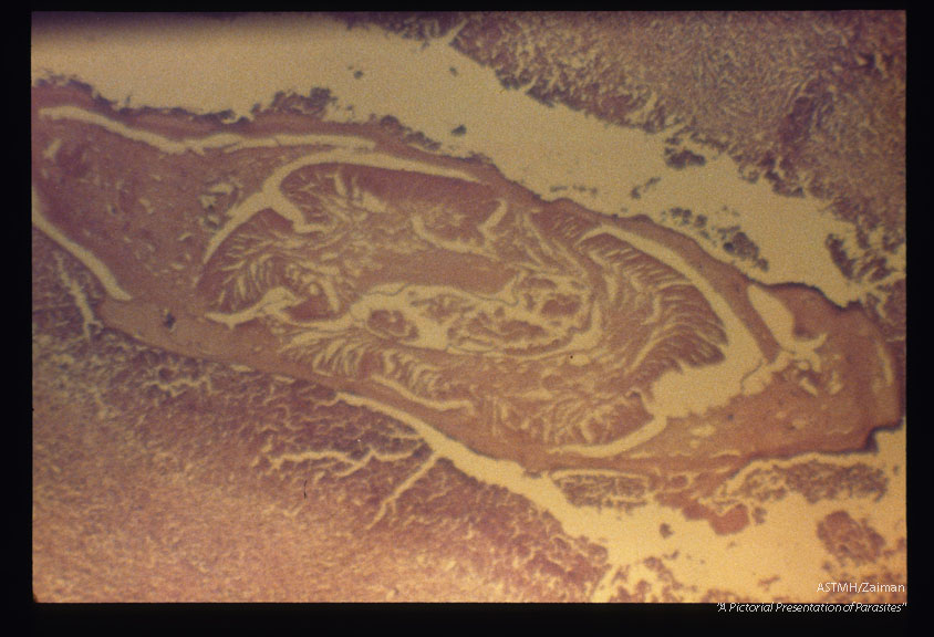 Description: Abdominal mass which contained adult Ascaris (1407, 1408) and eggs (1409) was surgically removed from a patient. There was direct communication with the large bowel. Note cell division in the egg (1409).