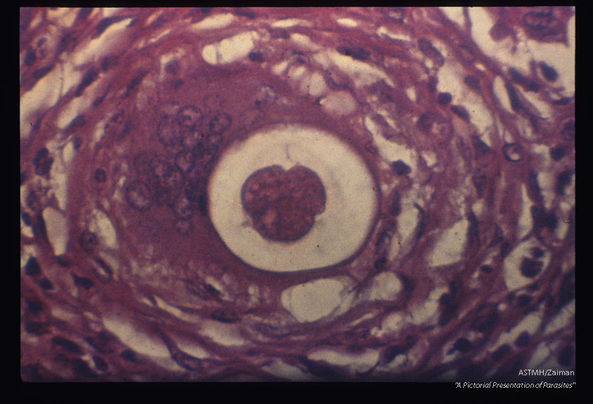 Description: Abdominal mass which contained adult Ascaris (1407, 1408) and eggs (1409) was surgically removed from a patient. There was direct communication with the large bowel. Note cell division in the egg (1409).