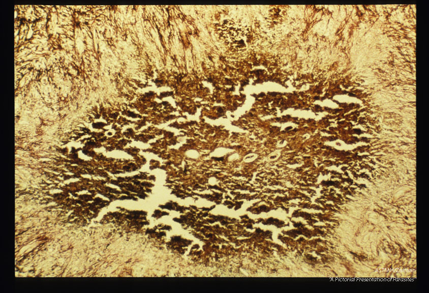 Description: Low and high power views of eggs in necrotic granulomatous pelvic lesions. The patient was a young female who suffered chronic dysrnenorrhea, dyspareunia and lower abdominal discomfort. Silver methenamine stain.