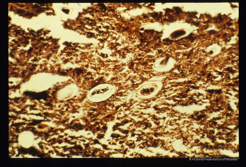 Description: Low and high power views of eggs in necrotic granulomatous pelvic lesions. The patient was a young female who suffered chronic dysrnenorrhea, dyspareunia and lower abdominal discomfort. Silver methenamine stain.