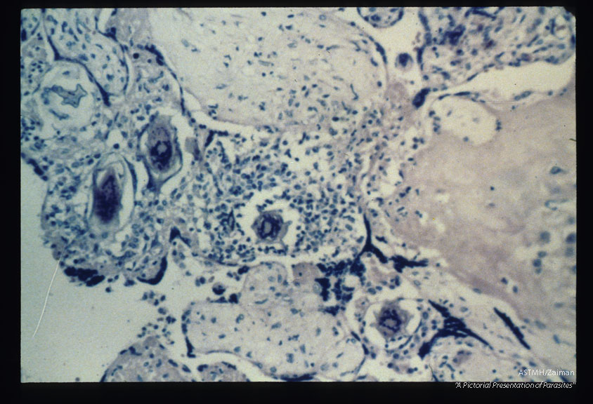 Schistosomal placentitis. Intervillous space and villi showing eggs within granulomata.