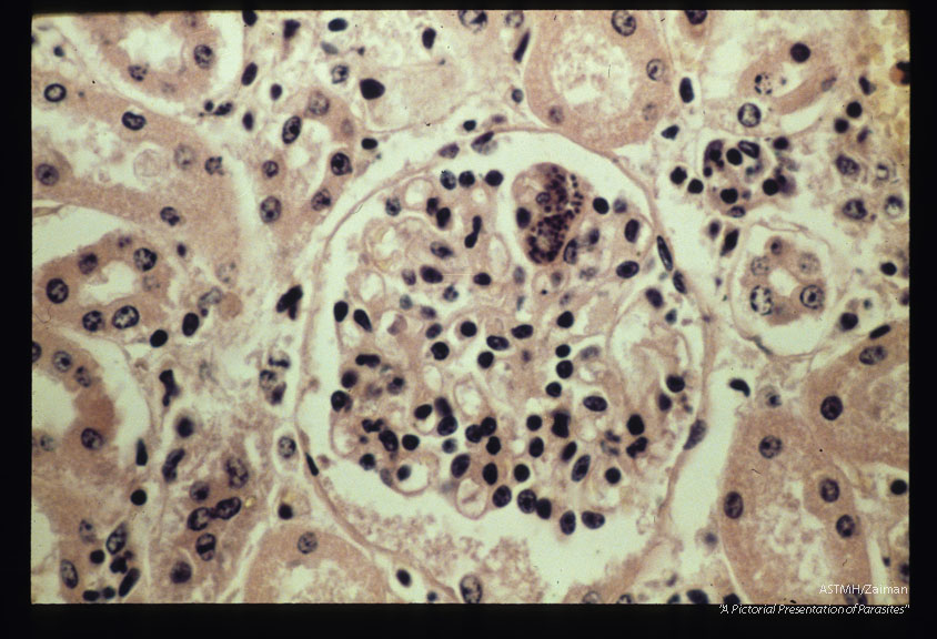 Description: ( = Sarcocystis cruzi, = Sarcocystis fusiformis). Schizont in endothelium of bovine kidney glomerulus.