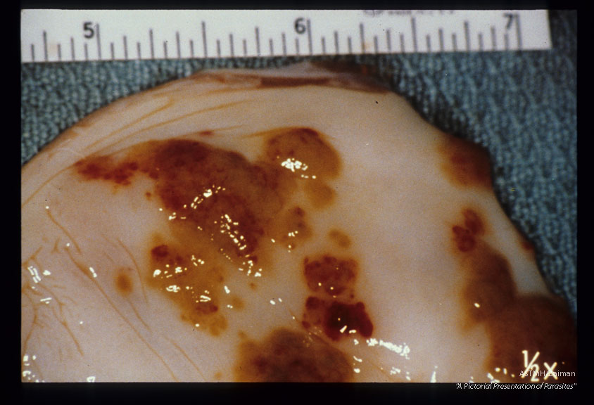 Description: Egg deposition in chimpanzee urinary bladder producing "polypoid patches".
