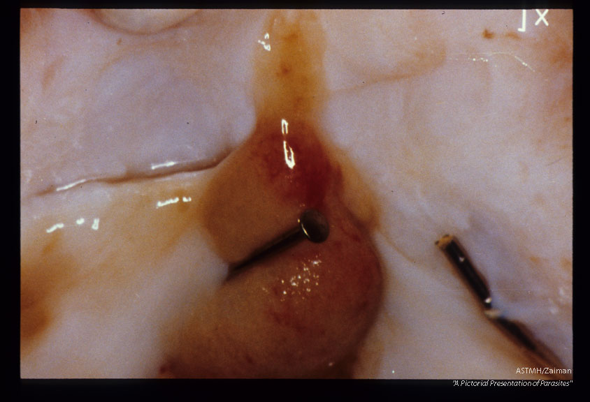 Description: Polypoid patch at ureterovesical junction in an experimentally infected chimpanzee. Nails were placed in the ureteral orifices.