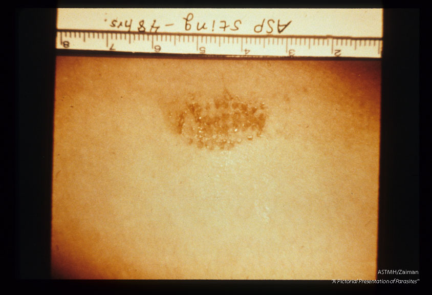 Description: Evolution of dermatitis produced by venom introduced into human skin by hollow larval poisonous spines. Twenty -four hours after exposure.