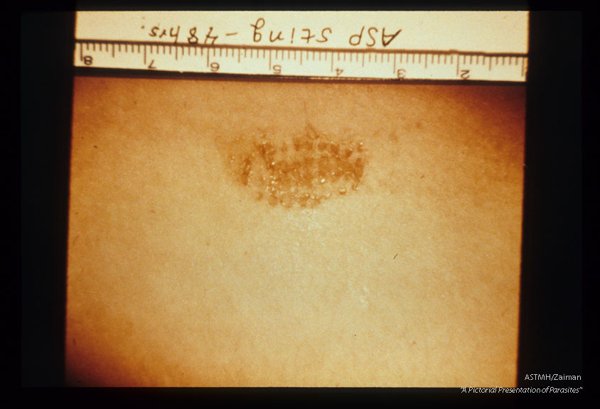 Description: Evolution of dermatitis produced by venom introduced into human skin by hollow larval poisonous spines. Forty-eight hours after exposure.