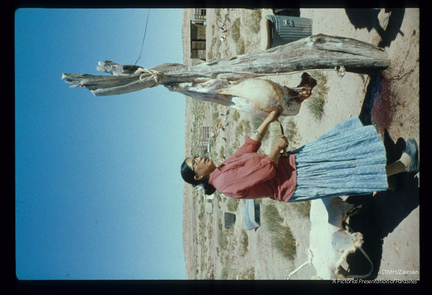 Description: Navajo woman butchering sheep.