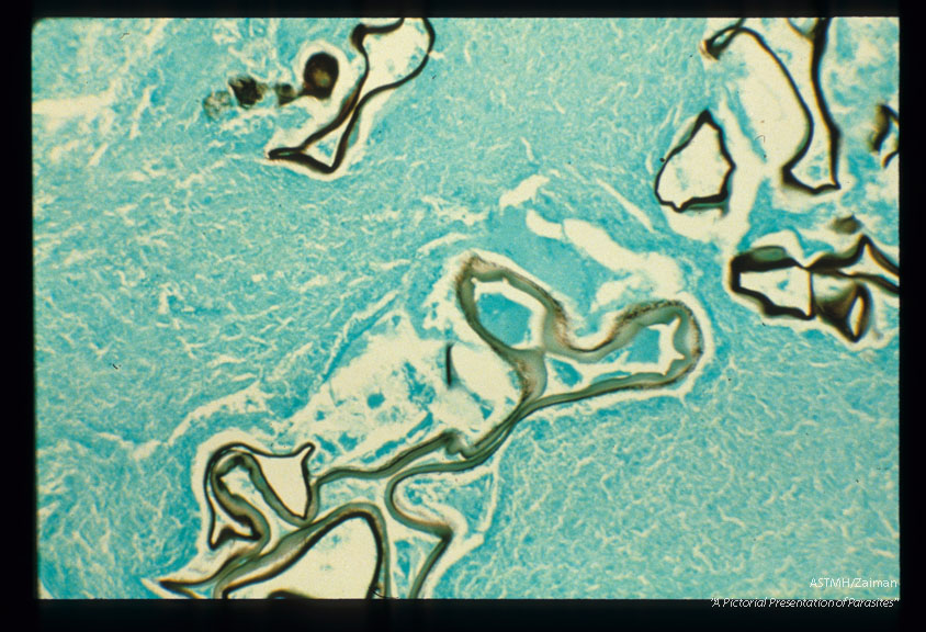 Description: Silver methenamine stain of infected human liver.