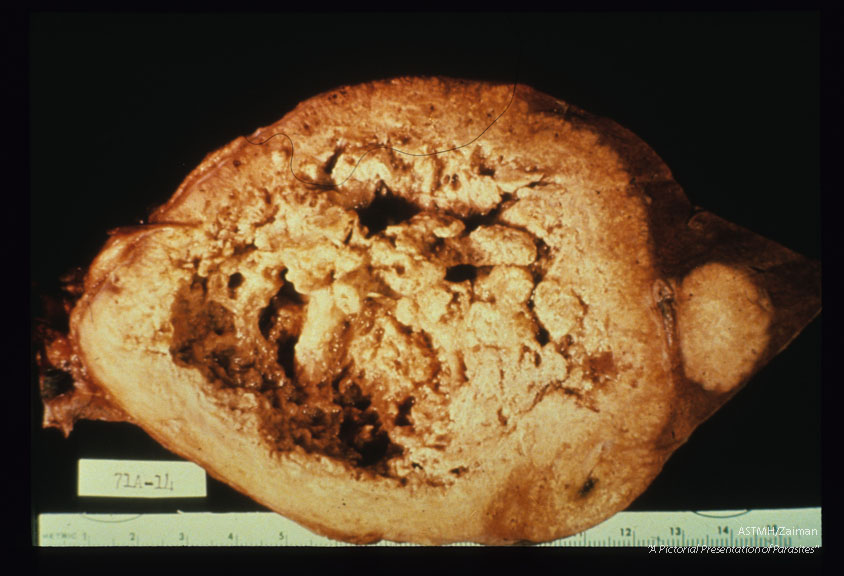 Description: Massive hepatic lesion with central necrosis. Alaska.