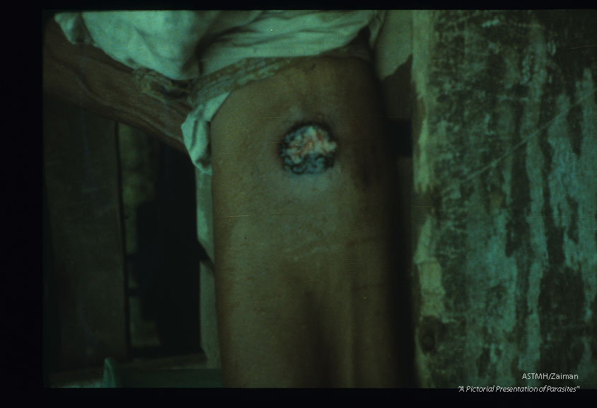 Description: Filarial ulcer on the medial aspect of the thigh.