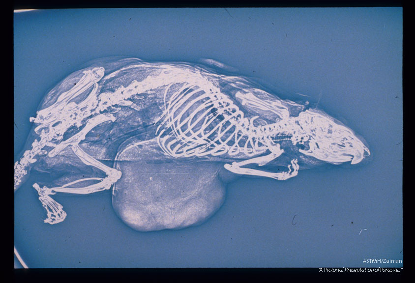 Description: Xerographic demonstration of calcified larvae in the muscles of a rat. The cysts present as minute white specks in the body musculature.