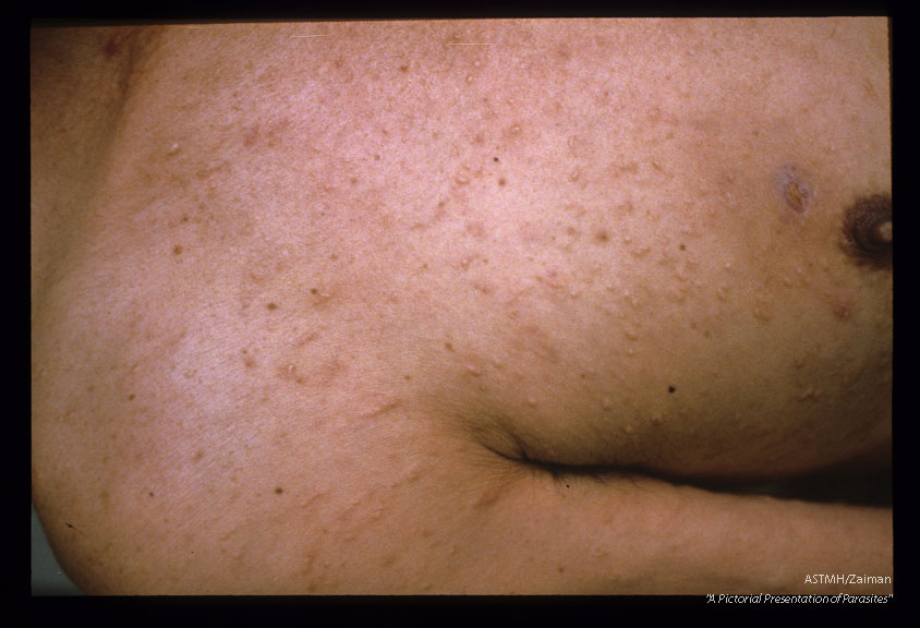 Gross pictures of male patient showing multiple skin lesions which are mostly papular and nodular. Linear elevations suggest shape of the worm beneath the skin. Note gynecomastia.