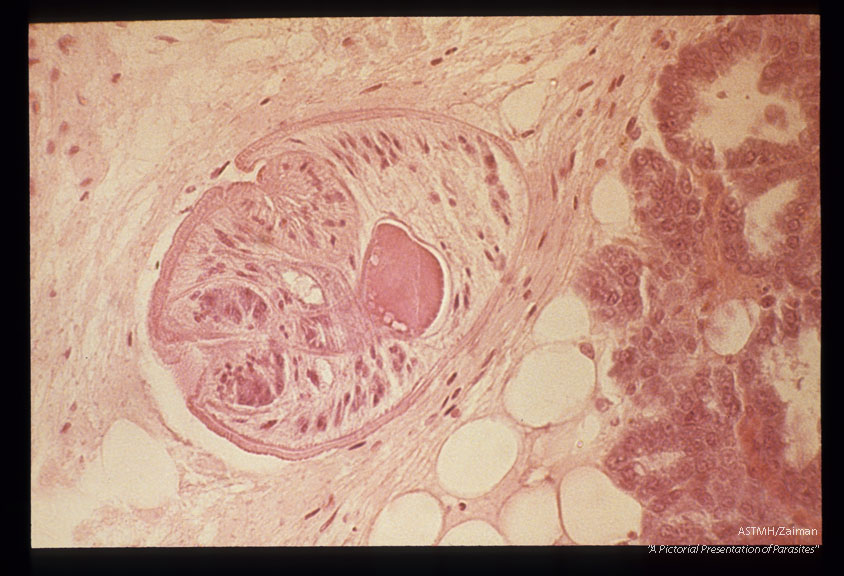 Description: Mesocercarial stage in the connective tissue of mouse mammary gland. Low and high magnifications.